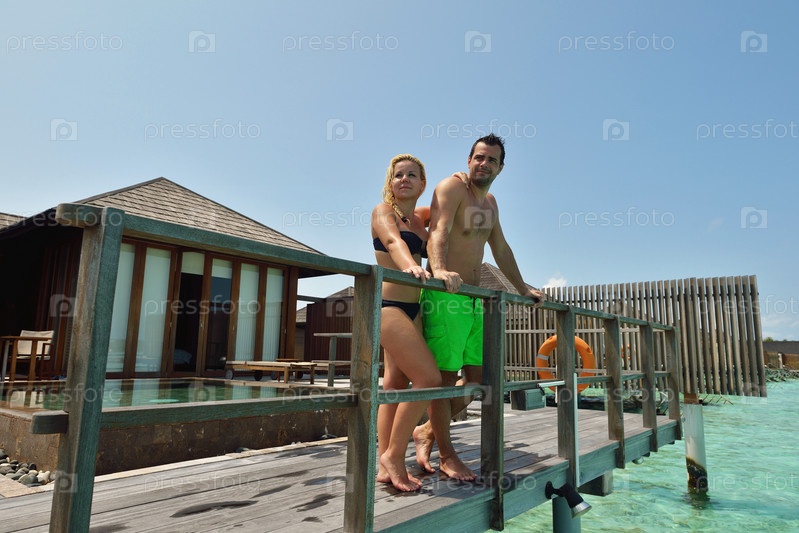 Счастливая молодая пара весело проводит время на пляже во время летних каникул