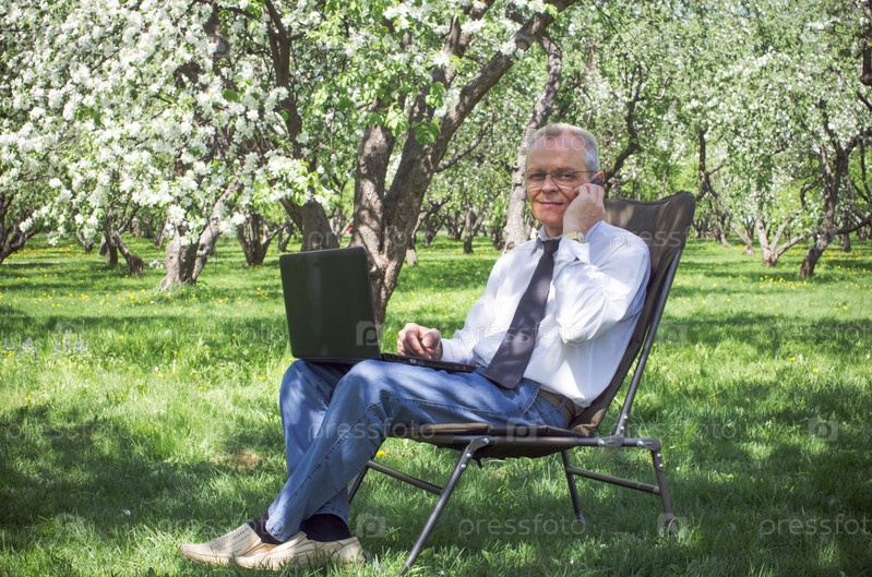 Предприниматель использует интернет для работы в весеннем саду