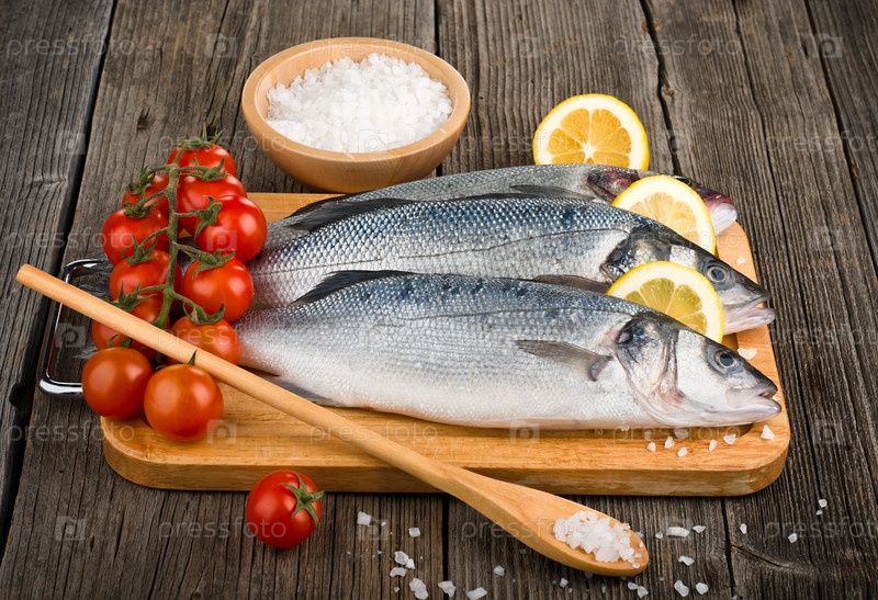 Сырой сибас на деревянной доске