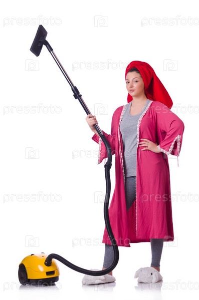 Женщина с пылесосом на белом фоне