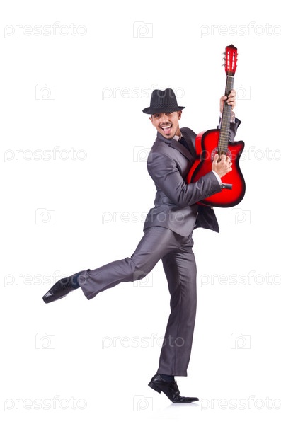 Бизнесмен играет на гитаре, изолированный на белом фоне