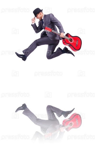 Бизнесмен играет на гитаре, изолированный на белом фоне
