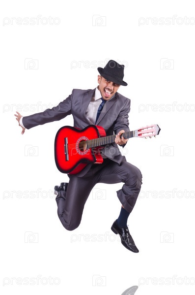 Бизнесмен играет на гитаре, изолированный на белом фоне