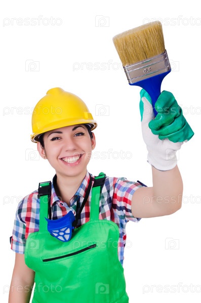 Женщина маляр с кистью на белом