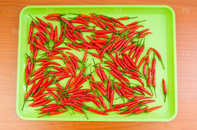 Красные жгучие перцы на зеленом подносе
