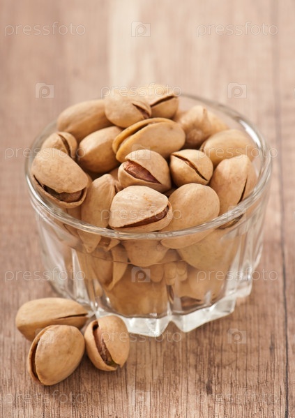 Фисташки в стеклянной тарелке на деревянном фоне