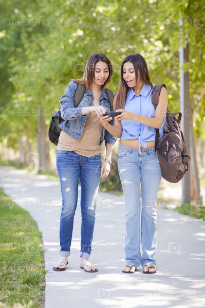 Молодые сестры-близнецы беседуют о сотовом телефоне