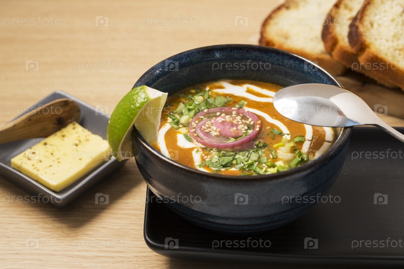 Миска с супом и сочным лимоном