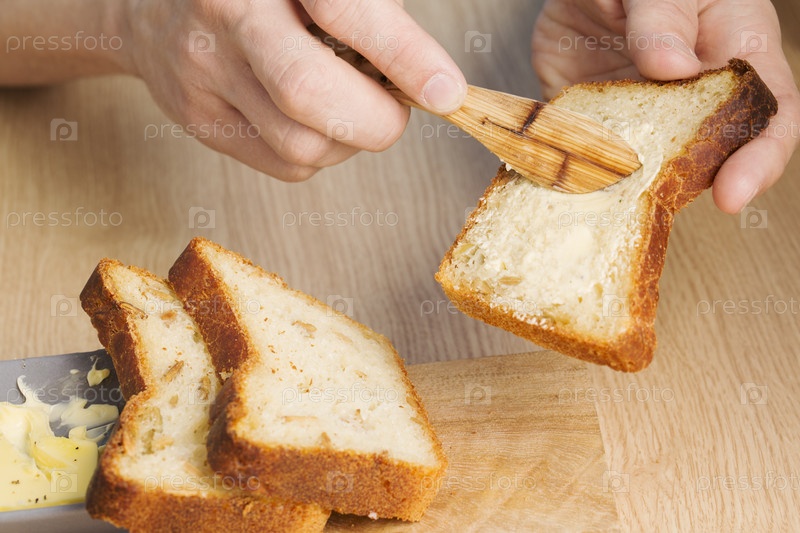 Масло намазывают на кусок хлеба к завтраку