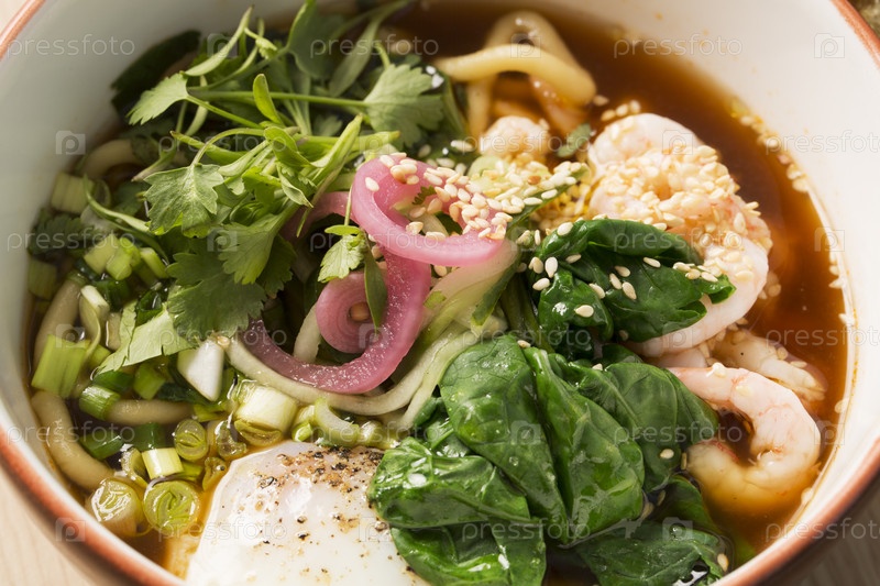 Миска с горячим бульоном с креветками