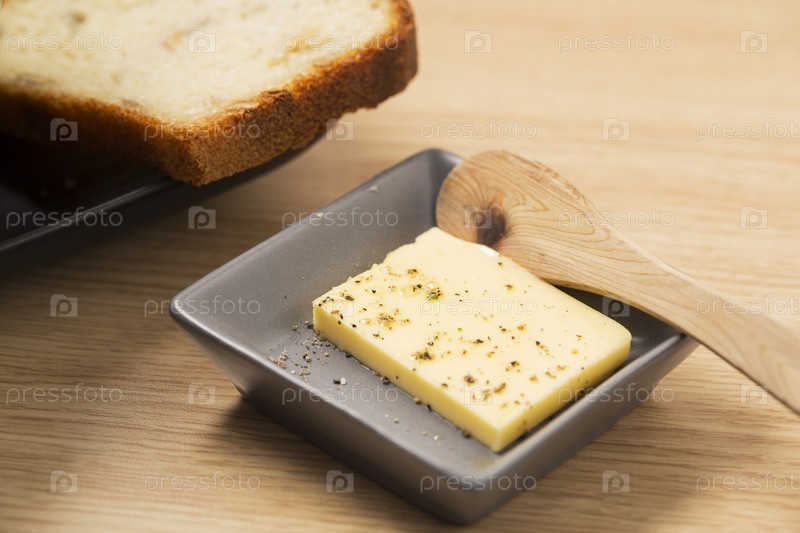 Ломтики хлеба и растопленное масло в миске