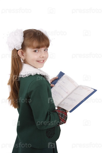 Девочка в школьной форме держит дневник с оценками