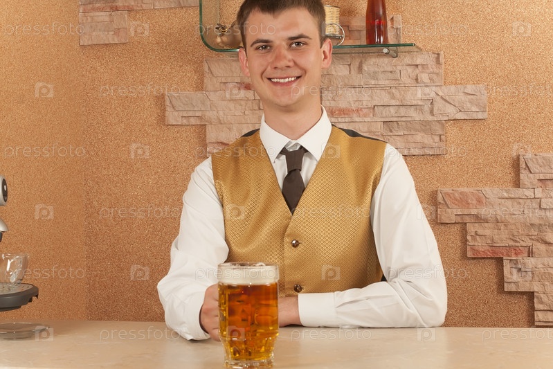 Официант держит стакан пива