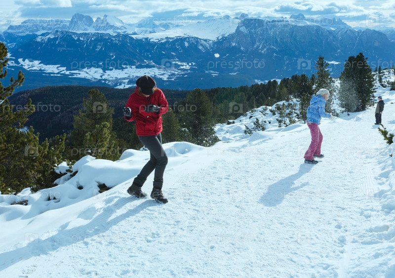 Семья играет в снежки на склоне горы