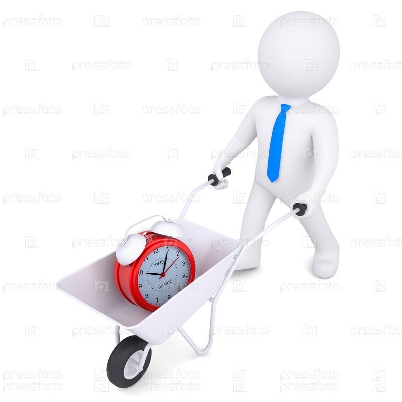 3D белый человек везёт в тележке часы