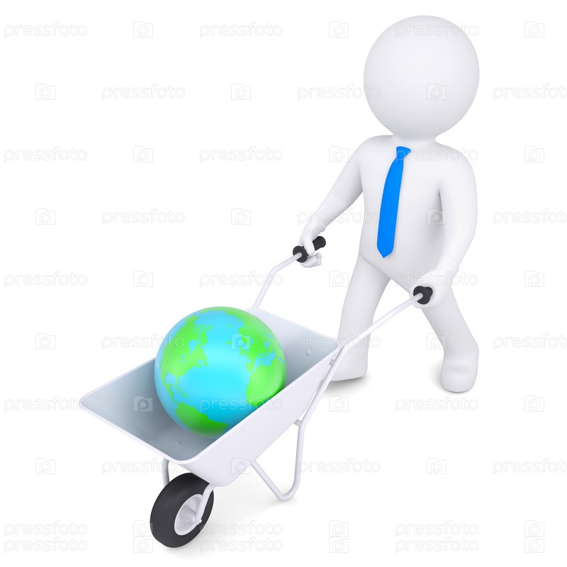 3D белый человек везёт в тележке планету Земля