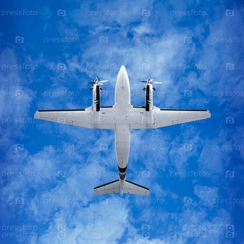 Двухвинтовой самолет на фоне неба, вид снизу