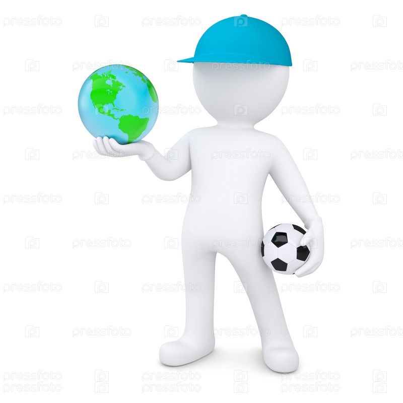 3D белый человек держит футбольный мяч и глобус