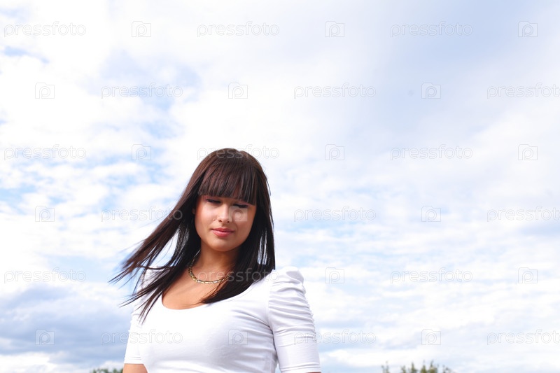 Красивая длинноволосая брюнетка на фоне неба