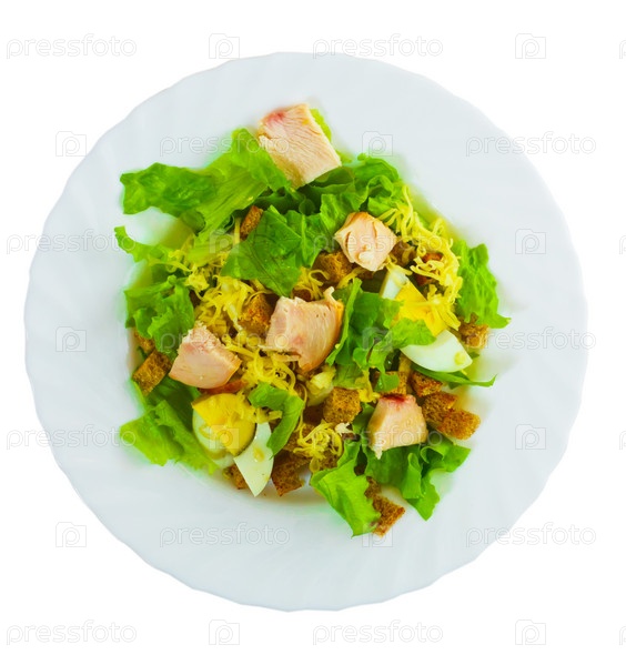 Салат с колбасой, сыром и хлебом, изолированный белый фон
