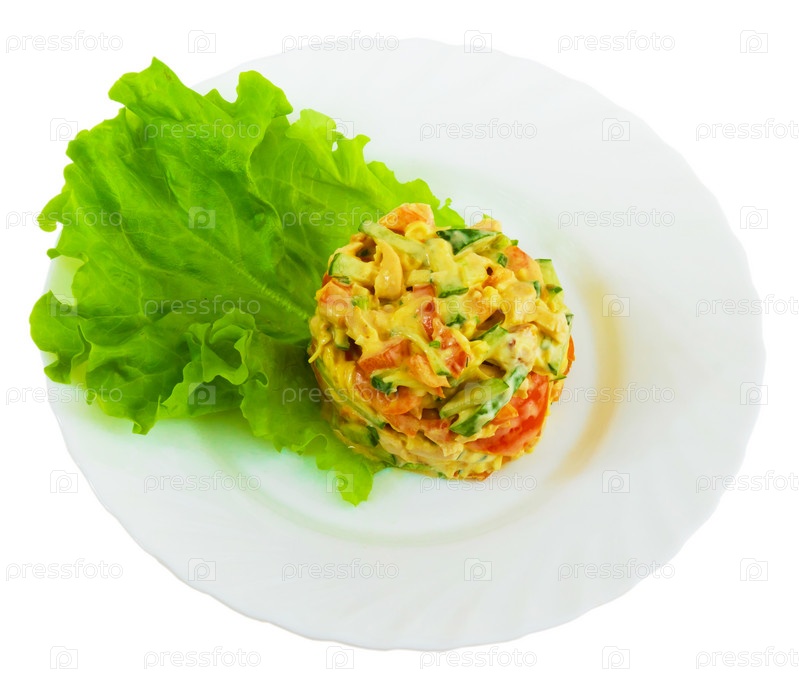 Салат из огурцов, помидоров, майонеза и яблок, изолирован на белом фоне