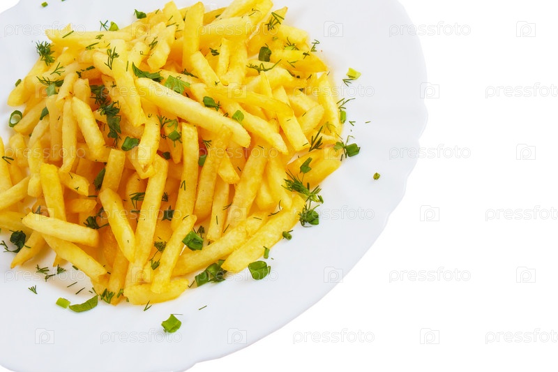 Вкусный картофель фри, укроп, изолированные на белом фоне