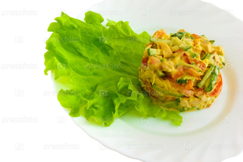 Помидоры, огурцы, вкусный майонез, яблоко в салате, изолирован на белом фоне