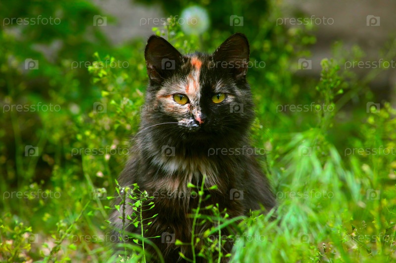 Необычная разноцветная кошка сидит в зеленой траве и смотрит на камеру