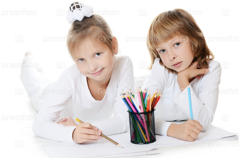 Две девочки рисуют цветными карандашами, изолированные на белом