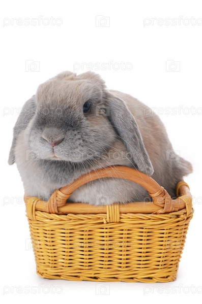 Серый кролик в корзине, изолированный на белом