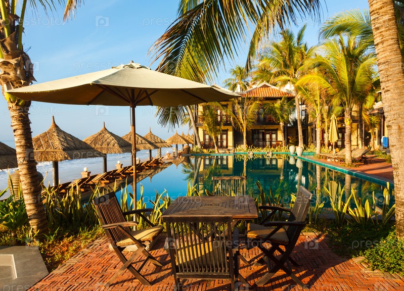 Бассейн и зонтики на пляже