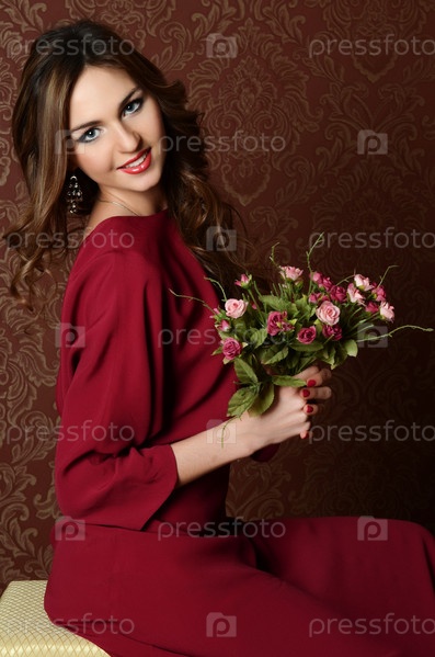 Элегантная чувственный молодая женщина в бордовом платье