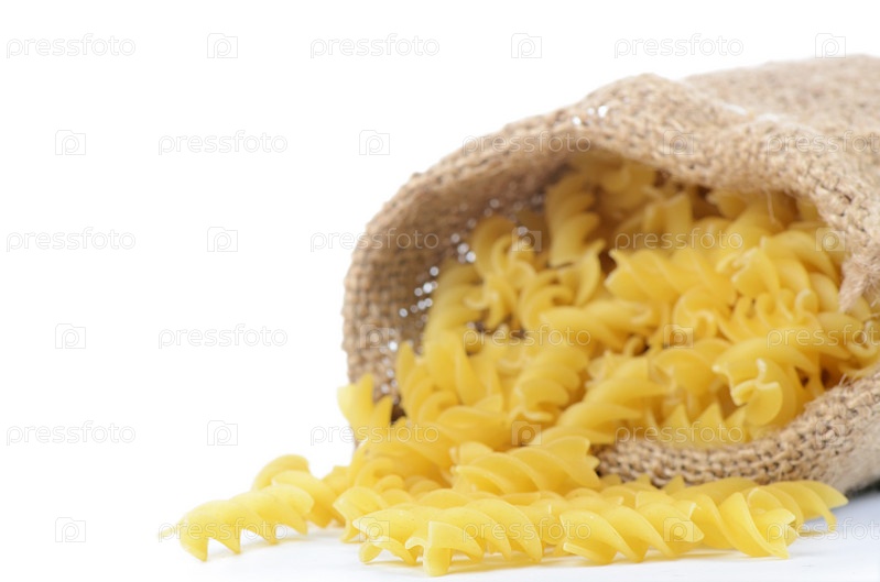 Спиральные макароны в мешке, изолированные на белом фоне