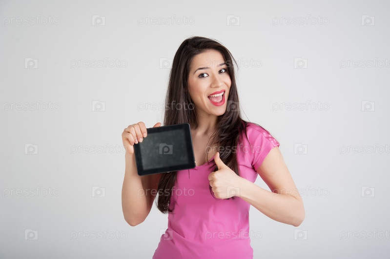 Красивая женщина радуется планшетному компьютеру