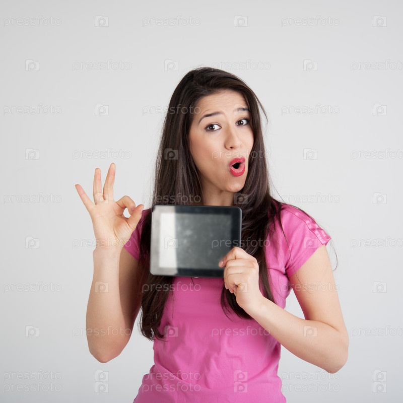 Красивая женщина радуется планшетному компьютеру
