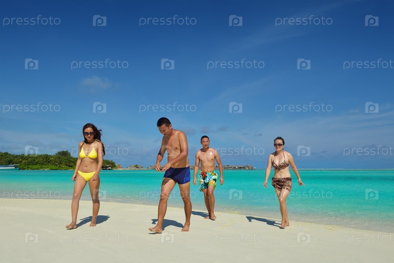 Группа счастливых молодых людей веселится на пляже