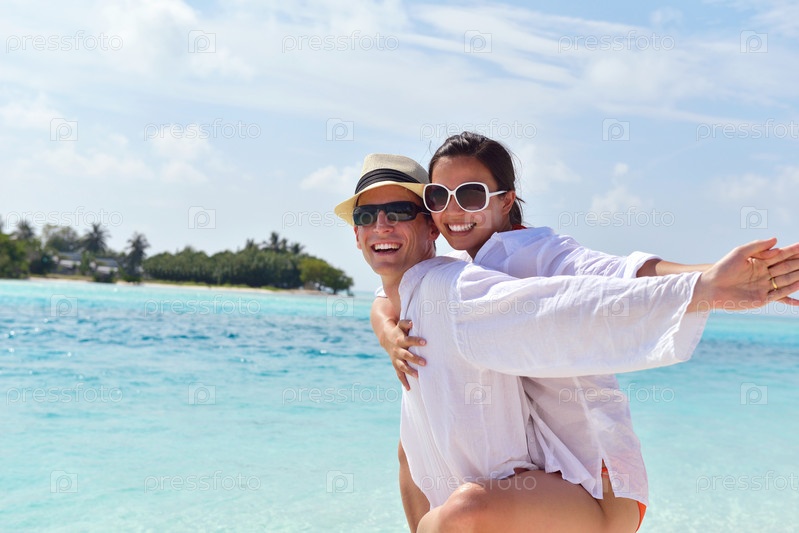 Счастливая молодая пара весело проводит время на пляже