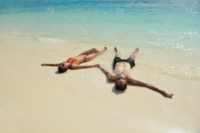 Счастливая молодая пара весело проводит время на пляже