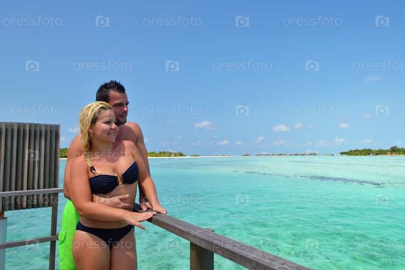 Счастливая молодая пара на летних каникулах весело проводит время на пляже