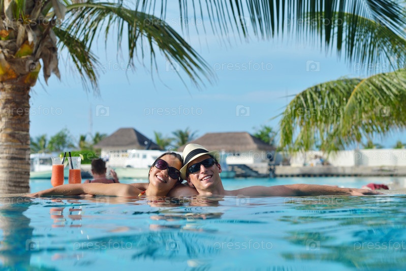 Счастливая молодая пара весело проводит время на пляже