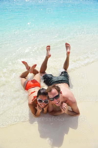 Счастливая молодая пара весело проводит время на пляже