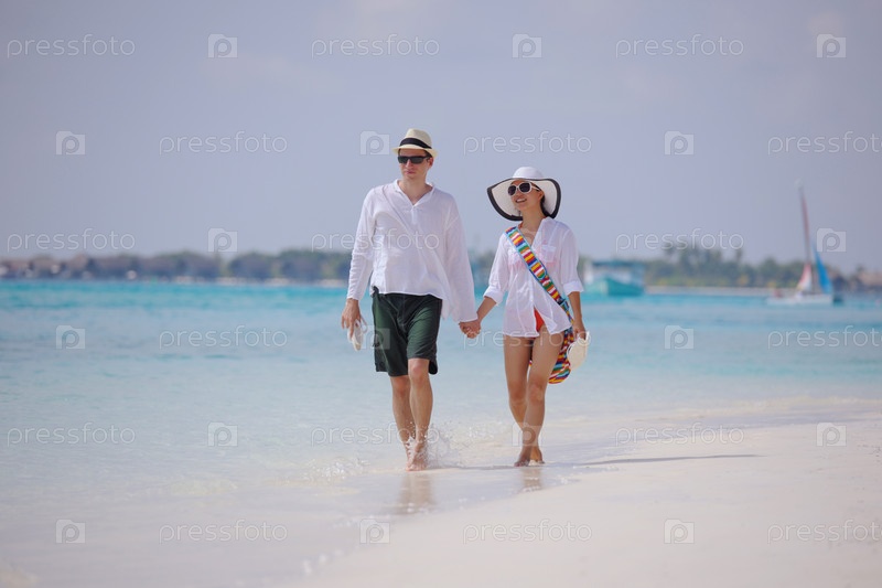 Счастливая молодая пара весело проводит время на пляже