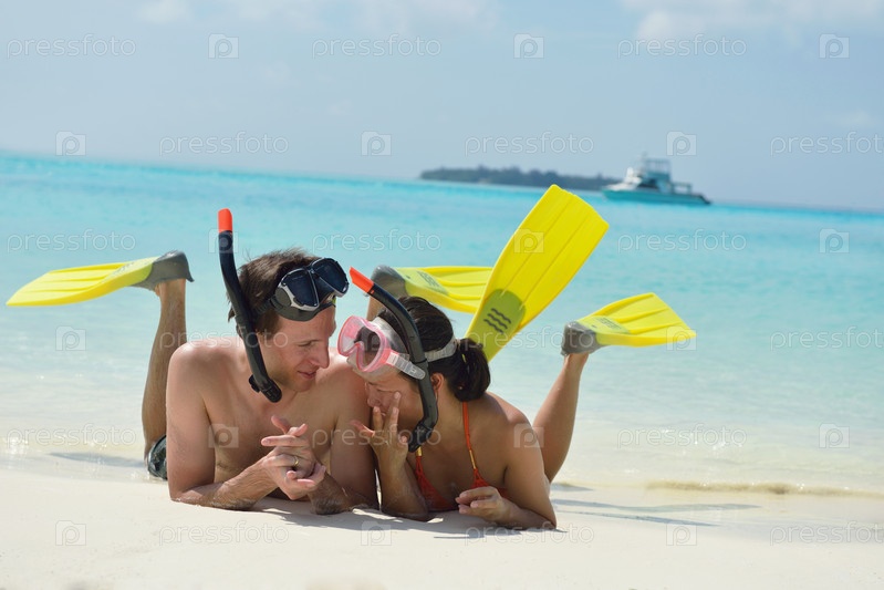 Счастливая молодая пара весело проводит время на пляже