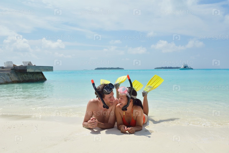 Счастливая молодая пара весело проводит время на пляже