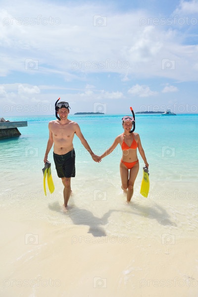 Счастливая молодая пара весело проводит время на пляже