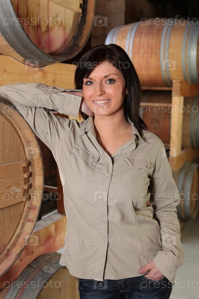 Женщина стоит в винном погребе