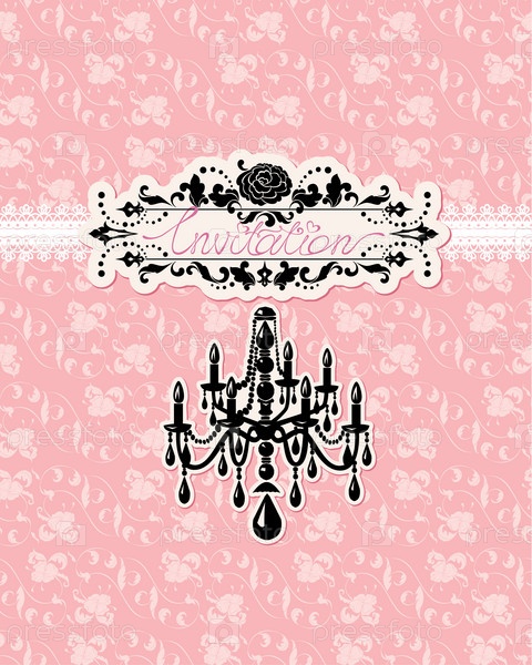 Свадебное приглашение с роскошной люстрой на розовом цветочном фоне
