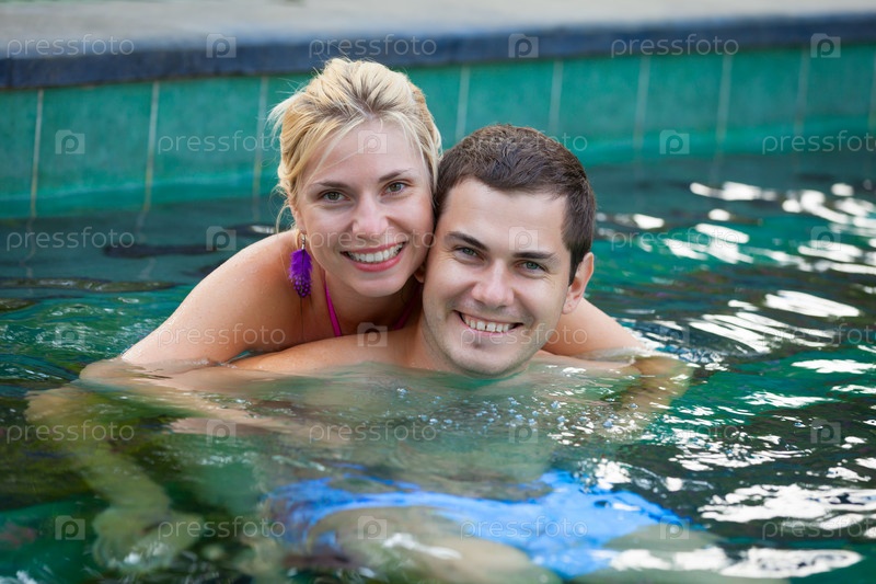 Счастливые молодожены в плавательном бассейне в медовый месяц