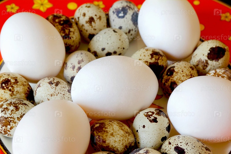 Красное блюдо с куриными и перепелиными яйцами