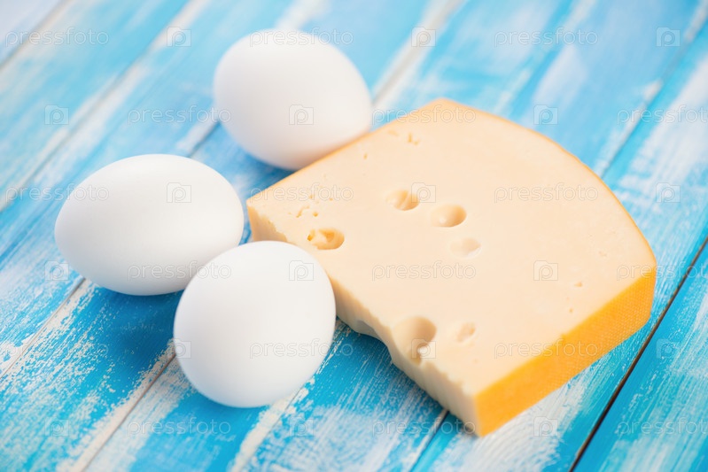 Свежий сыр и куриные яйца на деревянных досках